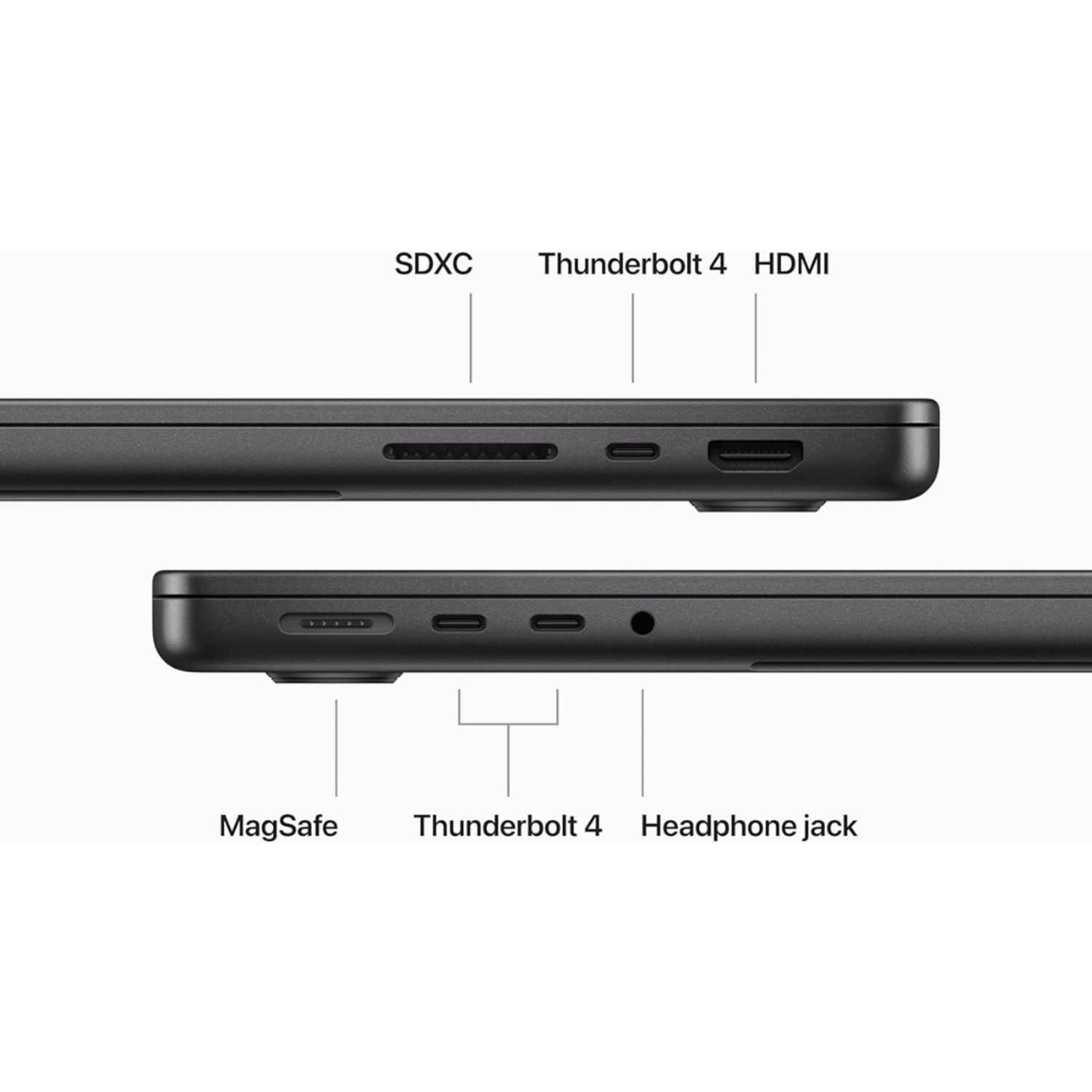 - CONÉCTATE CON TODO — La MacBook Pro de 14 pulgadas viene con tres puertos Thunderbolt 5, un puerto de carga MagSafe 3, ranura para tarjeta SDXC, puerto HDMI y entrada para audífonos. Y admite hasta dos monitores externos en el modelo con chip M4 Pro, y hasta cuatro en el modelo con chip M4 Max.