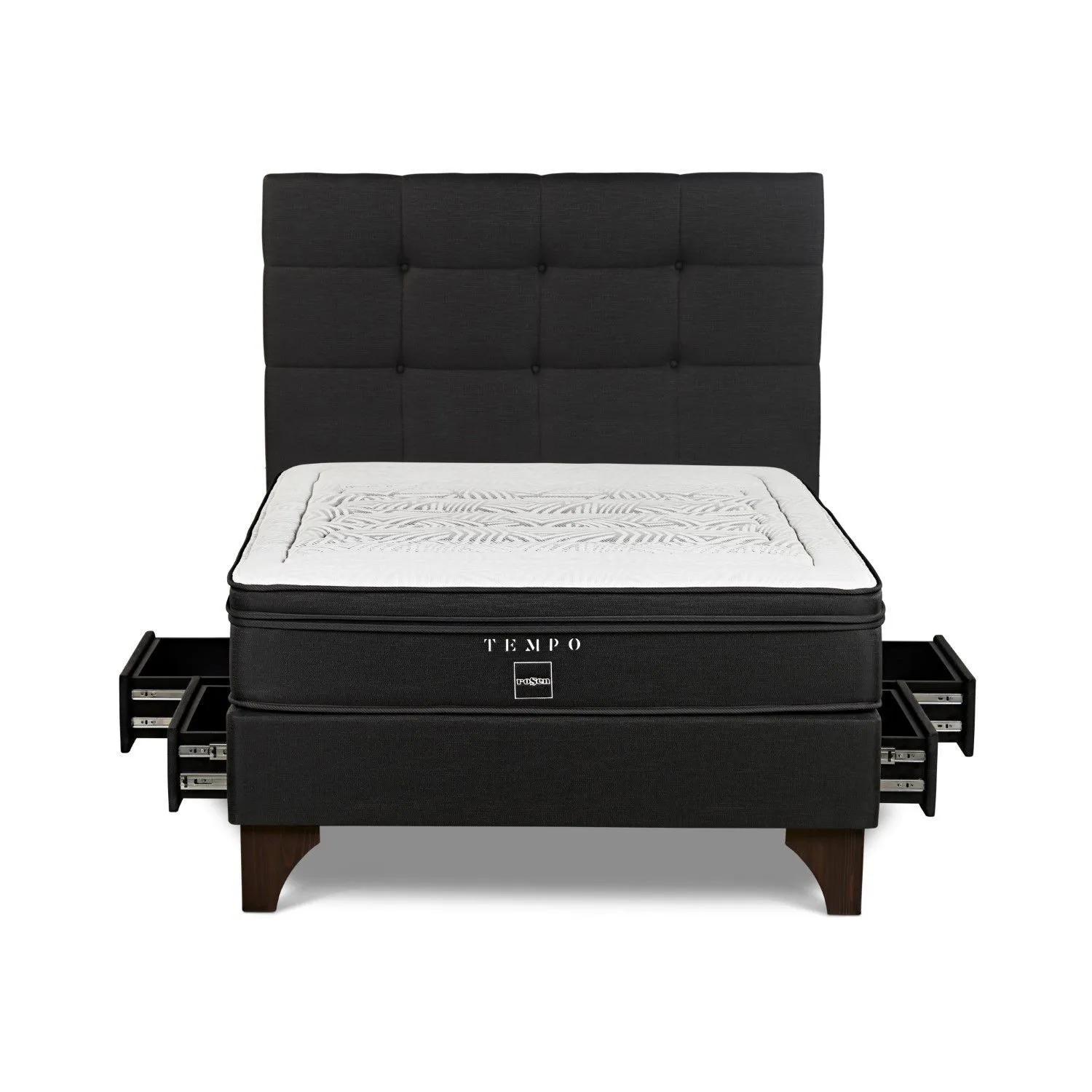 Tempo cuenta con una estructura de resortes Pocket enfundados de respuesta personalizada. Esta tecnología permite la perfecta adaptación del colchón al contorno y peso del cuerpo. Adicionalmente evita que los movimientos de una persona se trasmitan hacia el sector de la otra.